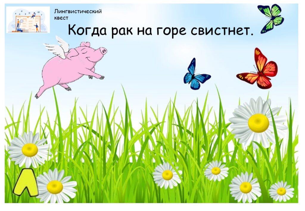 3. Школьник находит плакат, на котором нарисован сюжет иностранной пословицы, например “Когда свинья полетит”, вписывает в свой листок русский аналог с плаката – “Когда рак на горе свистнет”. Летящая свинья на рисунке является подсказкой.
